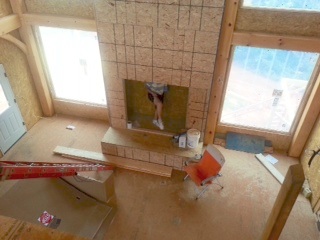 The stonemasons could come inside to start working on the fireplace on this rainy day if only the fireplace insert had been delivered and installed.  But alas, the fireplace insert is coming tomorrow. Here is my silly sister in the fireplace like Santa (who’s house, I might add is across the lake and ready to move in, but she still lives in Florida! see her blog )