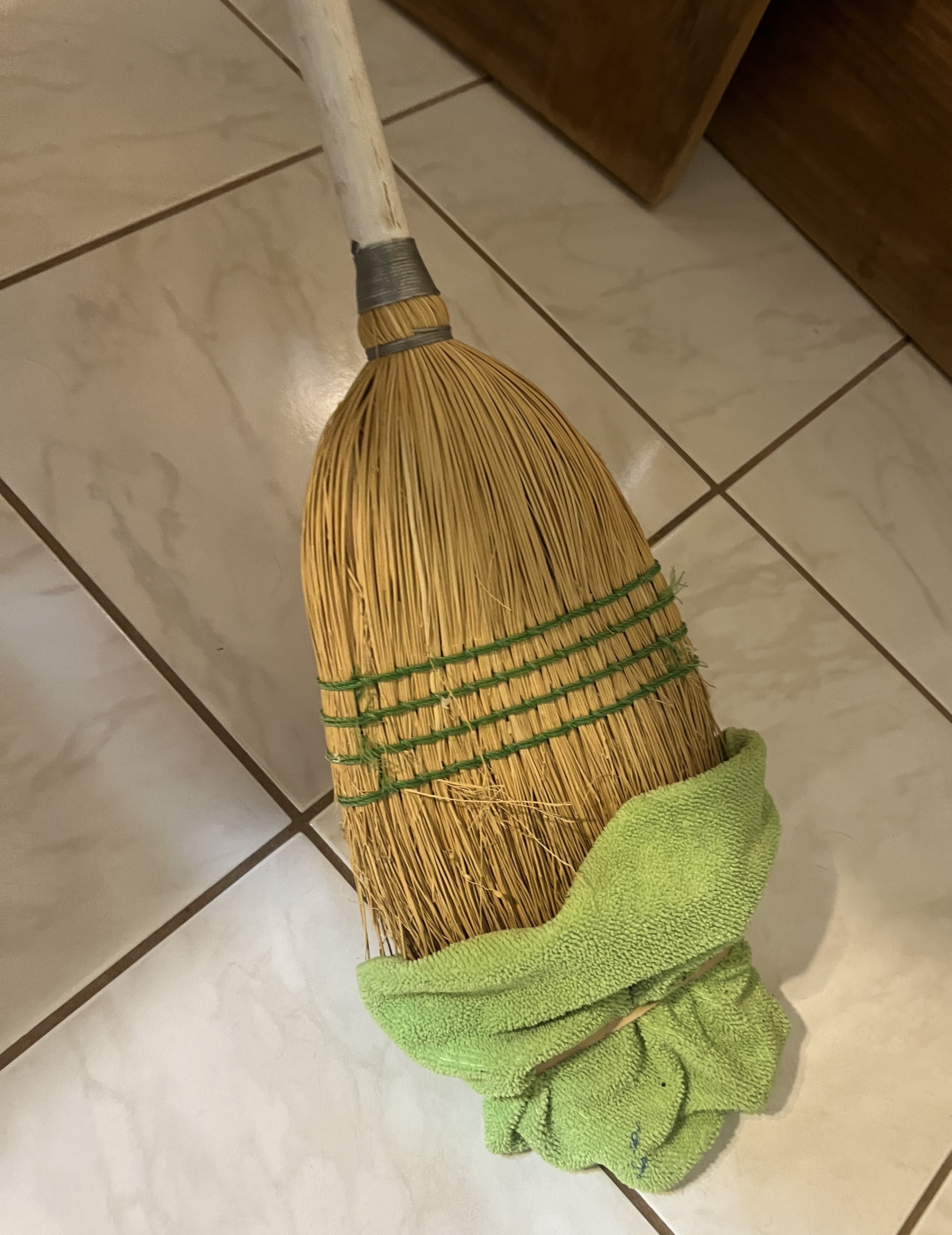 Our housekeeper is now 77 years old and (like an energizer bunny), won’t quit/retire.  She has been with us 10 years and is quite good natured and dependable. But as it is with many of us, she can no longer get down (on her knees) on the floor where you can see drips, splashes, and hair.  This is especially true on tile bathroom floors. I saw her doing this one day.  She had attached an absorbent, but damp rag to the broom to use on the floor. No pail of water nor mop.