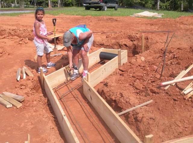 While Jack and hearty neighbor, Steve, started framing the footers, I went to Raleigh to pick up our seven-year old grand daughter Destiny to come spend a week with us. She has been a great help. At seven, kids want to be helpful and she loves to hang with us!