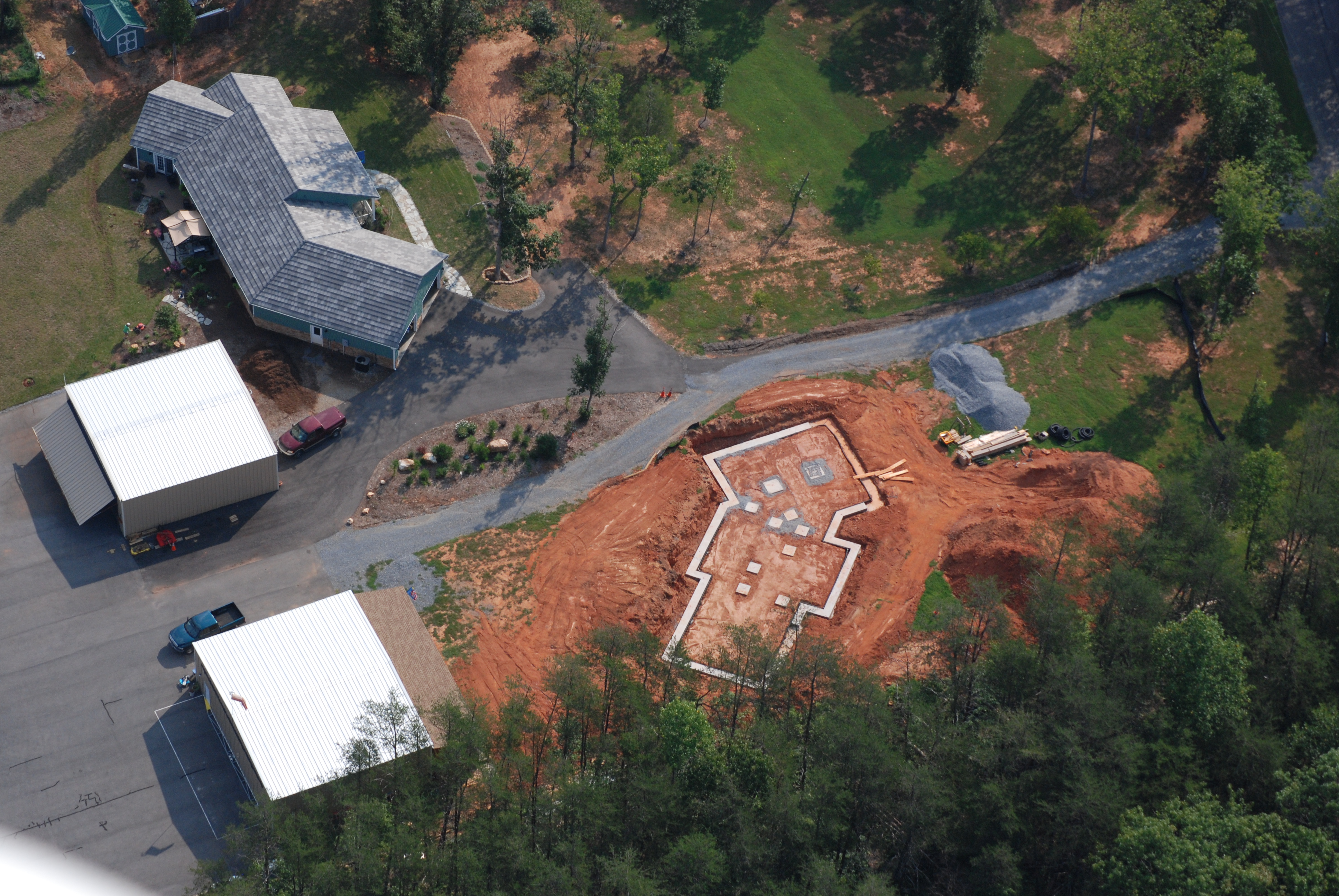 No new work on the house except putting gravel down in the floor area and spreading it.  Spreading it with a rake was good shoulder exercise!  We did hire a new wall pouring contractor.  They delivered the forms yesterday so we are fairly confident they will show up Monday (even tho it is Labor Day) to start forming walls and pour them next week.  Having a strong and firm foundation is a critical part of building the house.  I have often used this parallel when teaching about families and children.  The first three years are critical in building a relationship with children, and building personal relationships on multiple aspects of getting along (not just sex or not just a business partnership, for example) is crucial.  OK- I will give lecturing a break!  This nice aerial photo shows our footers and hangar plus the neighbor’s house and hangar.
